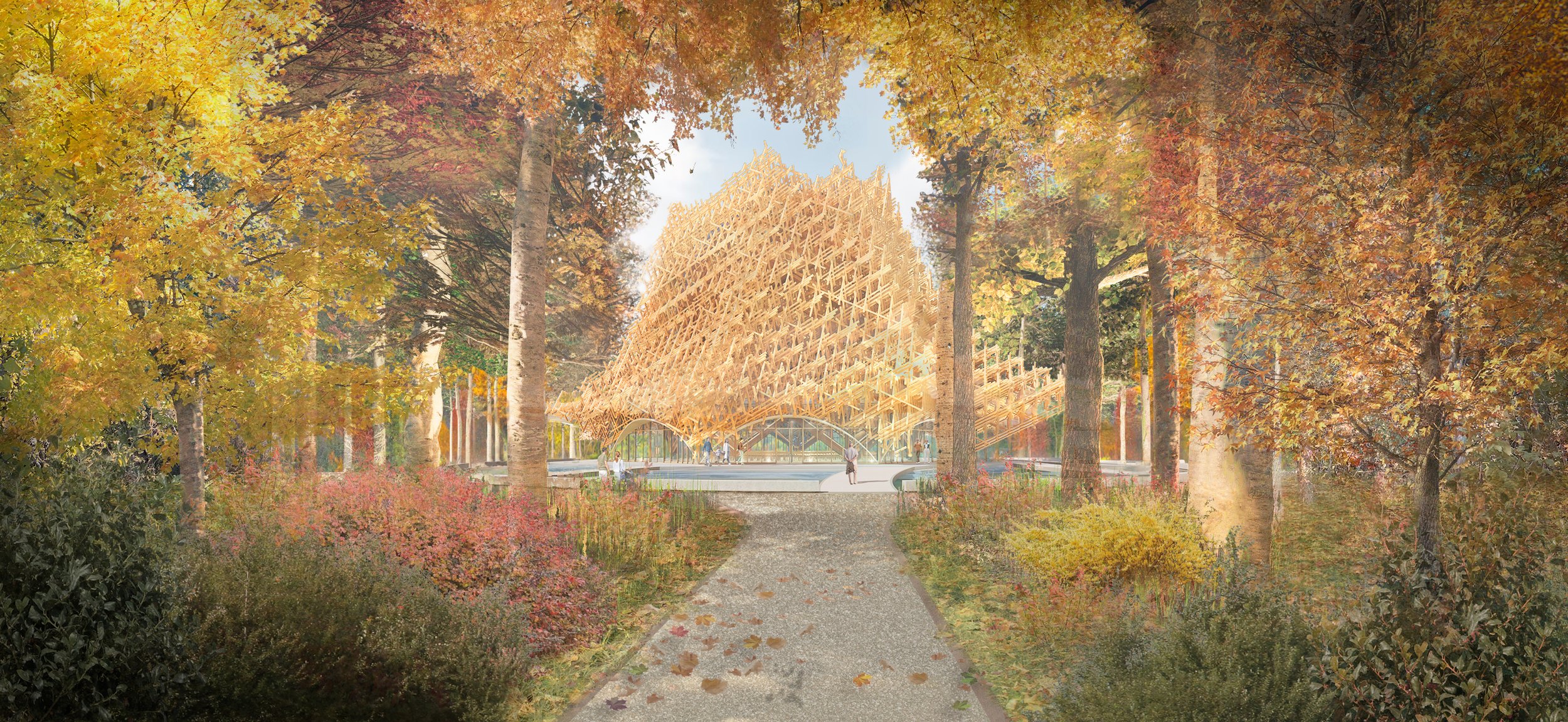 The Forest Temple is constructed out of a lightweight lattice nest which follows a regular, repeatable, non-parametric pattern for ease of constructability. The dome structure that supports the nest is constructed in a triangulated timber glue-laminated diagrid consisting of straight beams concealed with steel connectors. A double-glazed triangular flat sheet window system then envelops the timber diagrid. The domed sanctuary is then encircled by a one storey vestibule to protect visitors from the variable climate, allowing the temple to be accessed throughout all seasons. The interior lattice is then suspended from the dome structure using 4-inch square timber segments crafted from small profile Canadian timber. This creates an opportunity for visitors to contribute wood from across the country, uniting the community through construction. The exterior lattice is self-supporting and constructed of regularly available, digitally printed fiberglass-reinforces composite stone.